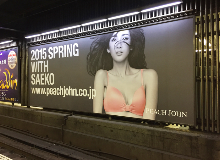 先日、渋谷駅ホームでもPEACH JOHNの巨大看板を見かけた。
